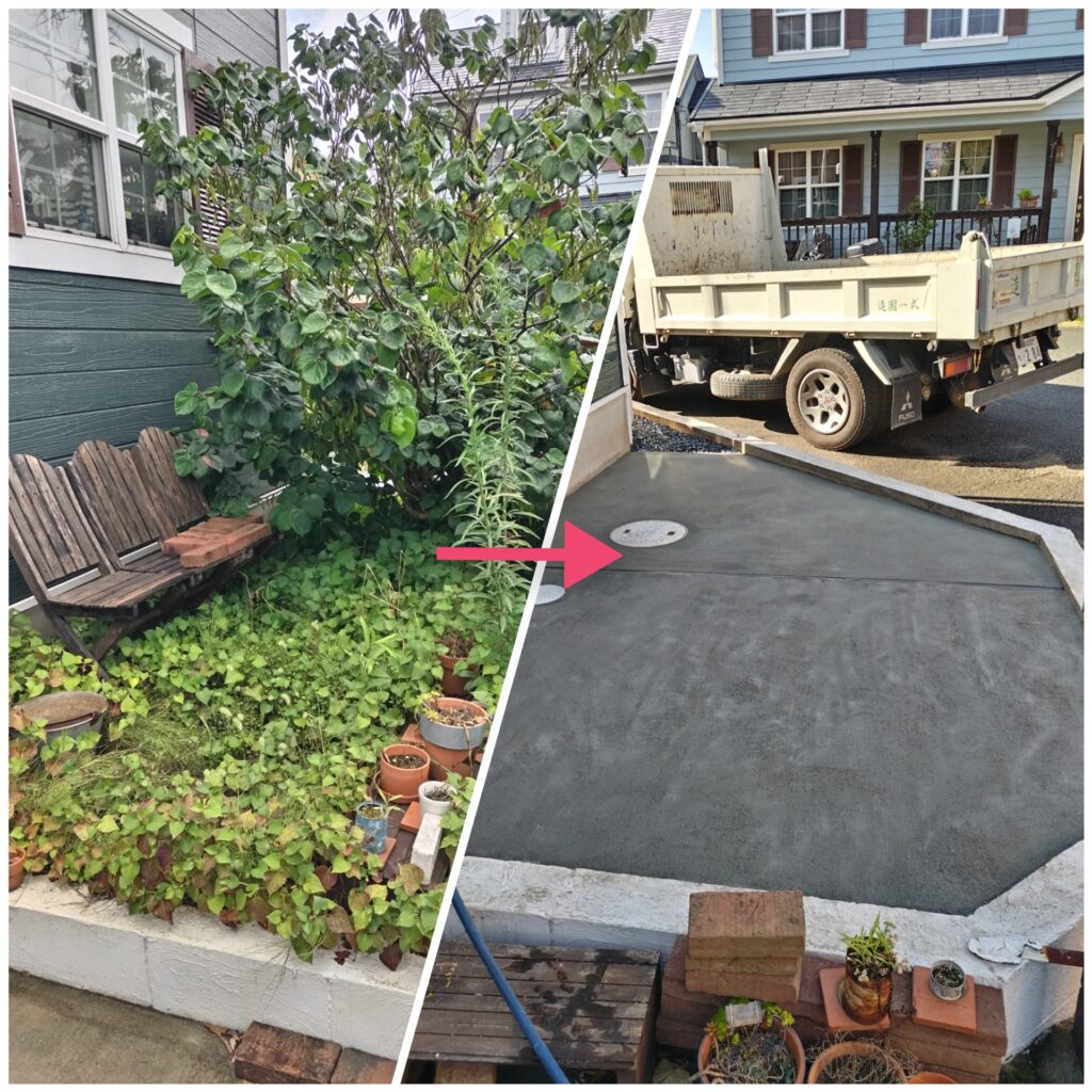 八千代市下市場にて防草対策としてコンクリート打設工事、砂利敷きを施工させていただきました。